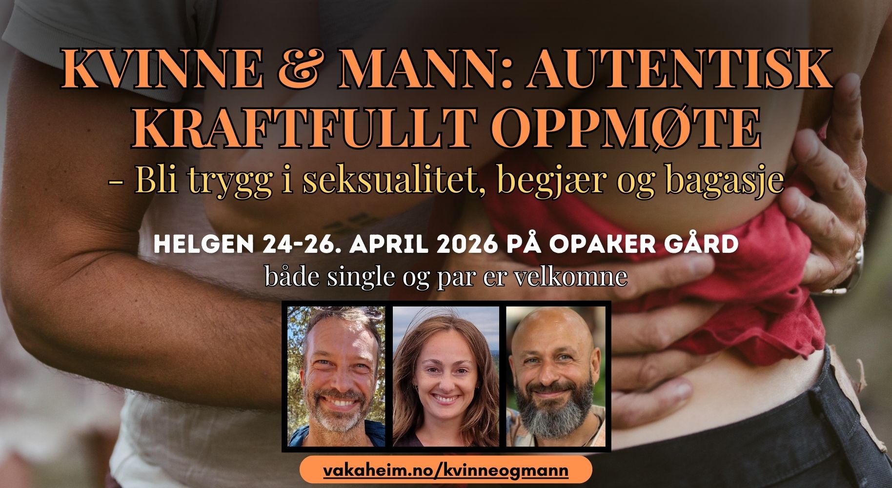 Samtidig har vi bestemt oss for at vi ønsker å skape en helg der mann-kvinne-dynamikker får fullt fokus og med forankring i perspektivet av biologisk kjønn. Denne helgen er designet rundt og handler om å utforske tiltrekning mellom menn og kvinner. Om du er i kontakt med den og ønsker å utforske den, så er du hjertelig velkommen. Om du kjenner stor motstand mot dette eller har tanker om at dette på noe vis er feil, så er ikke dette helgen for deg. Men ta gjerne kontakt med oss om du ønsker å sparre med oss om dette.
